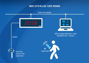 NDC 57/4 R L20 12DC RS485 sú veľkoplošné digitálne LED hodiny, ktoré zobrazujú informácie o čase a dátume. Ich estetický dizajn a vysoká svietivosť LED prvkov so širokým pozorovacím uhlom ich robia vhodnými pre použitie v moderných interiérových prostrediach, ako sú kancelárie, banky, verejné inštitúcie, autobusové a vlakové stanice, letiská, priemyselné závody, výrobné linky, sklady, atď. Všetky zobrazované údaje a parametre hodín (napríklad čas, dátum, trvanie zobrazovania každej informácie, jas, a pod.) je možné nastaviť pomocou diaľkového ovládača alebo prostredníctvom počítačovej aplikácie cez pripojenie USB. Montáž hodín je jednoduchá. Hodiny sú dodávané s držiakom na stenu, napájacím adaptérom a montážnym návodom. V ponuke je rôzne voliteľné príslušenstvo, ktorých zoznam a popis sa nachádzajú nižšie.